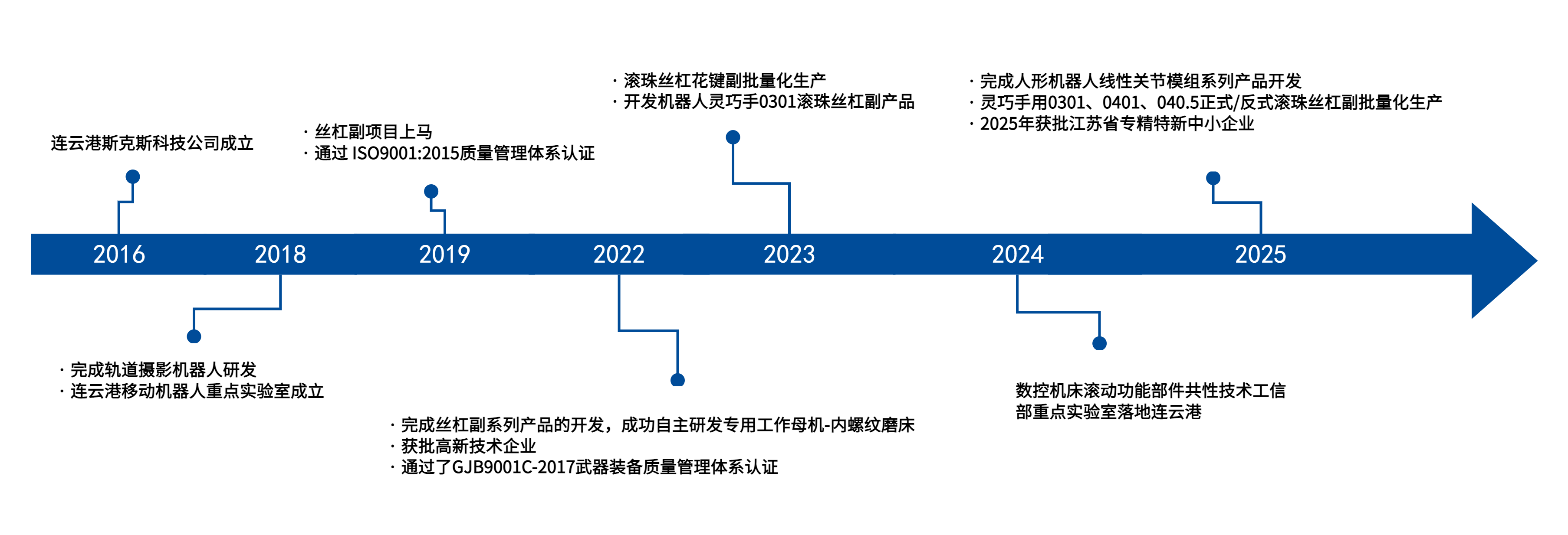 ◆ 2019-2022年 滚珠丝杠副项目成功启动 2019年丝杠副项目上马,三年内建队伍、攻克难关,完成丝杠副系列产品的开发,成功自主研发专用工作母机-内螺纹磨床,获批高新技术企业。 2019年公司通过 ISO9001:2015质量管理体系认证;2022年通过了GJB9001C-2017武器装备质量管理体系认证,同年通过了国家高新技术企业认定。 ◆ 2023年 滚珠丝杠花键副批量化生产 开发发库卡(KUKA)、埃斯顿、汇川、新时达、配天、卡诺普、小野智能等十余家工业机器人终端客户;开发机器人灵巧手0301滚珠丝杠副产品